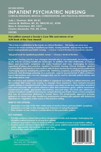 "Inpatient Psychiatric Nursing: Clinical Strategies and Practical Interventions describes specific aspects of inpatient psychiatric nursing practice, with a focus on three types of inpatient treatment goals: keeping the patient safe, stabilizing symptoms, and promoting engagement in treatment. The book also discusses discharge planning. The book is organized into two parts: Part I is divided according to patient behaviors, while Part II focuses on interventions that nurses can employ to manage behaviors. Part I features a consistent chapter format so that specific content is easy to access, and each chapter includes a comprehensive table covering goals, areas of assessment, and interventions of the chapter's covered behavior. The symptomatic approach will provide a translational model to improve outcomes for psychiatric patients with medical symptoms and medical patients with psychiatric symptoms. This book is intended for any nurse working with patients having behavioral disturbances regardless of the cause"--