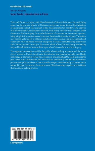 This book focuses on input trade liberalization in China and discusses the underlying causes and profound effects of Chinese enterprises facing import liberalization of intermediate input. The content of this book includes ten chapters. The analysis of this book mainly uses academic research, with policy study for a few chapters. Most chapters in this book apply the standard method of contemporary economic systems, integrating into the most advanced economic theories of international trade. The author uses theoretical models to obtain predictions which receive empirical support and carries out strict empirical research using data of China's manufacturing enterprises and China's customs to analyze the causes which affect Chinese enterprises facing import liberalization of intermediate input after China's reform and opening-up.