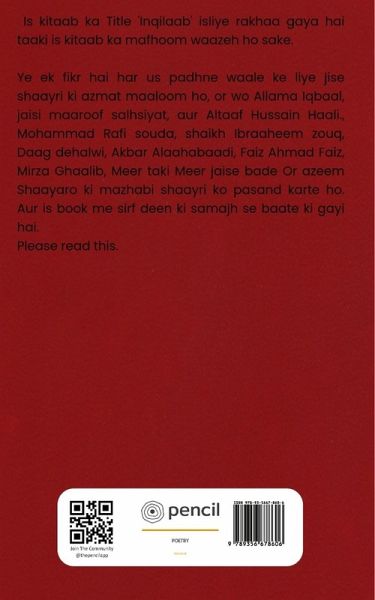 Is kitaab ka Title 'Inqilaab' isliye rakhaa gaya hai taaki is kitaab ka mafhoom waazeh ho sake. Ye ek fikr hai har us padhne waale ke liye jise shaayri ki azmat maaloom ho, or wo Allama Iqbaal, jaisi maaroof salhsiyat, aur Altaaf Hussain Haali., Mohammad Rafi souda, shaikh Ibraaheem zouq, Daag dehalwi, Akbar Alaahabaadi, Faiz Ahmad Faiz, Mirza Ghaalib, Meer taki Meer jaise bade Or azeem Shaayaro ki mazhabi shaayri ko pasand karte ho. Aur is book me sirf deen ki samajh se baate ki gayi hai. Please read this.
