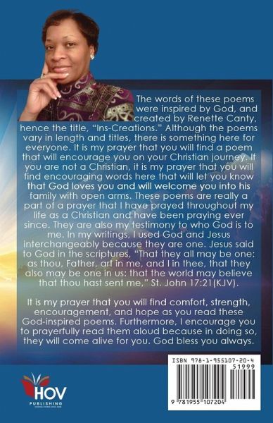 The words of these poems were inspired by God, and created by Renette Canty, hence the title, "Ins-Creations." Although the poems vary in length and titles, there is something here for everyone. It is my prayer that you will find a poem that will encourage you on your Christian journey. If you are not a Christian, it is my prayer that you will find encouraging words here that will let you know that God loves you and will welcome you into his family with open arms. These poems are a part of a prayer that I have prayed throughout my life as a Christian and have been praying ever since. They are also my testimony to who God is to me. In my writings, I used God and Jesus interchangeably because they are one. Jesus said to God in the scriptures, "That they all may be one: as thou, Father, art in me, and I in thee, that they also may be one in us: that the world may believe that thou hast sent me," St. John 17:21(KJV). It is my prayer that you will find comfort, strength, encouragement, and hope as you read these God-inspired poems. Furthermore, I encourage you to prayerfully read them aloud because in doing so, they will come alive for you. God bless you always.