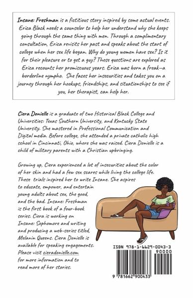 Insane: Freshman is a fictitious story inspired by some actual events. Erica Black needs a counselor to help her understand why she keeps going through the same thing with men. Through a complimentary consultation, Erica revisits her past and speaks about the start of college when her sex life began. Why do young women have sex? Is it for their pleasure or to get a guy? These questions are explored as Erica recounts her promiscuous years. Erica was born a freak-a borderline nympho. She faces her insecurities and takes you on a journey through her hookups, friendships, and situationships to see if you, her therapist, can help her.
