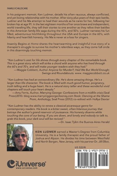 In his poignant memoir, Ken Ludmer, details his often raucous, always conflicted, and yet loving relationship with his mother. After sixty plus years of their epic battle, Ludmer and his Ma attempt to heal their wounds as he cares for her, following her broken hip at age 91. In the last eighteen months of her once brave and independent, world traveling life, they tell their stories to one another as they relive their battles in this American family life saga during the 40?s, and 50?s. Ludmer narrates his fun filled, adventurous hitchhiking throughout the USA and Europe in the 60?s, with hilarity and heartfelt honesty. His Ma is never at a loss for zingers. Insanity Begins at Home shares the heartwarming and insightful true story of a therapist?s struggle to survive his mother?s relentless ways, as they come full circle in this disarmingly touching memoir. ?Ken Ludmer?s zest for life shines through every chapter of the remarkable book. This is a great story which will strike a chord with anyone who has lived through the 60?s and 70?s. and will make younger readers wish they had.? ?Maggie Cobbett, Author Anyone for Murder?; Had We But World Enough; Swings and Roundabouts. www. maggiecobbett.co.uk ?Ken Ludmer has had an extraordinary life. He?s done amazing things. He?s a larger than life character. The book is filled with much good humor, poignancy, truth telling and a huge heart. He is a natural story teller and these wonderful vivid chapters will touch your heart deeply.? ?Amy Ferris, Author, Marrying George: Confessions from a midlife crisis (Seal Press)2010. blog www.marryinggeorgeclooney,com Book: Dancing at the Shame Prom, Anthology, Seal Press (2012) co-edited with Hollye Dexter ?Ken Ludmer has the ability to renew a classical picaresque genre for contemporary readers. His book is a bitter sweet, often hilarious journey that betrays the author?s grand reservoir of jouissance. His honesty disarms while touching the core of our being. If you are down, and lonely and nobody to talk to, grab this book, your dark soul will be revived.? ?Dr. Isaac Tylim the Buenos Aires Herald