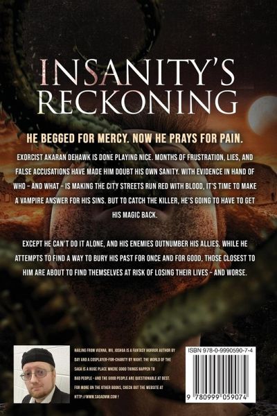 He begged for mercy. Now he prays for pain. Exorcist Akaran DeHawk is done playing nice. Months of frustration, lies, and false accusations have made him doubt his own sanity. With evidence in hand of who - and what - is making the city streets run red with blood, it's time to make a vampire answer for his sins. But to catch the killer, he's going to have to get his magic back. Except he can't do it alone, and his enemies outnumber his allies. While he attempts to find a way to bury his past for once and for good, those closest to him are about to find themselves at risk of losing their lives - and worse. Insanity's Reckoning is the brutal third book in the Auramancer's Exorcism dark fantasy quadrilogy and the next gore-filled entry in the Saga of the Dead Men Walking. If you like vengeful heroes, good guys that aren't, a world you can get lost in, and demons that would rather strike you dead than strike a deal, then you'll love Joshua E. B. Smith's unforgiving epic. Buy Insanity's Reckoning today - because there's a reckoning a comin' that you don't want to miss.