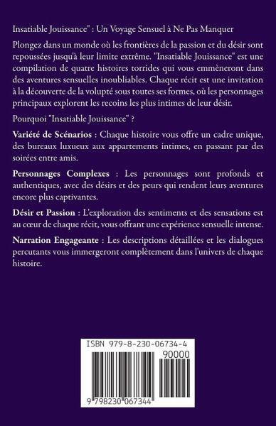 Insatiable Jouissance" : Un Voyage Sensuel à Ne Pas Manquer Plongez dans un monde où les frontières de la passion et du désir sont repoussées jusqu'à leur limite extrême. "Insatiable Jouissance" est une compilation de quatre histoires torrides qui vous emmèneront dans des aventures sensuelles inoubliables. Chaque récit est une invitation à la découverte de la volupté sous toutes ses formes, où les personnages principaux explorent les recoins les plus intimes de leur désir. Pourquoi "Insatiable Jouissance" ? Variété de Scénarios : Chaque histoire vous offre un cadre unique, des bureaux luxueux aux appartements intimes, en passant par des soirées entre amis. Personnages Complexes : Les personnages sont profonds et authentiques, avec des désirs et des peurs qui rendent leurs aventures encore plus captivantes. Désir et Passion : L'exploration des sentiments et des sensations est au cur de chaque récit, vous offrant une expérience sensuelle intense. Narration Engageante : Les descriptions détaillées et les dialogues percutants vous immergeront complètement dans l'univers de chaque histoire.