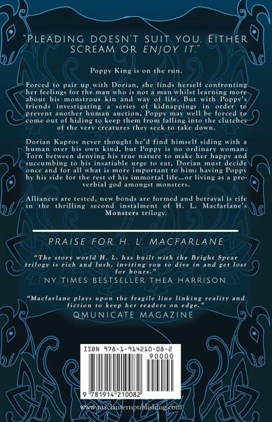 "Pleading doesn't suit you. Either scream or enjoy it." Poppy King is on the run. Forced to pair up with Dorian, she finds herself confronting her feelings for the man who is not a man whilst learning more about his monstrous kin and way of life. But with Poppy's friends investigating a series of kidnappings in order to prevent another human auction, Poppy may well be forced to come out of hiding to keep them from falling into the clutches of the very creatures they seek to take down. Dorian Kapros never thought he'd find himself siding with a human over his own kind, but Poppy is no ordinary woman. Torn between denying his true nature to make her happy and succumbing to his insatiable urge to eat, Dorian must decide once and for all what is more important to him: having Poppy by his side for the rest of his immortal life...or living as a proverbial god amongst monsters. Alliances are tested, new bonds are formed and betrayal is rife in the thrilling second instalment of H. L. Macfarlane's Monsters Trilogy.