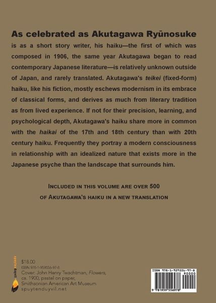 As celebrated as Akutagawa Ry¿nosuke is as a short story writer, his haiku-the first of which was composed in 1906, the same year Akutagawa began to read contemporary Japanese literature-is relatively unknown outside of Japan, and rarely translated. Akutagawa's teikei (fixed-form) haiku, like his fiction, mostly eschews modernism in its embrace of classical forms, and derives as much from literary tradition as from lived experience. If not for their precision, learning, and psychological depth, Akutagawa's haiku share more in common with the haikai of the 17th and 18th century than with 20th century haiku. Frequently they portray a modern consciousness in relationship with an idealized nature that exists more in the Japanese psyche than the landscape that surrounds him. Included in this volume are over 500 of Akutagawa's haiku in a new translation
