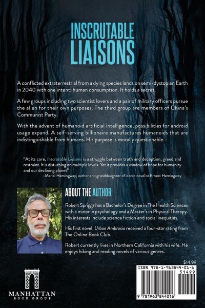 A conflicted extraterrestrial from a dying species lands on semi-dystopian Earth in 2040 with one intent: human consumption. It holds a secret. A few groups including two scientist lovers and a pair of military officers pursue the alien for their own purposes. The third group are members of China's Communist Party. With the advent of humanoid artificial intelligence, possibilities for android usage expand. A self-serving billionaire manufactures humanoids that are indistinguishable from humans. His purpose is morally questionable. Inscrutable Liaisons is disturbing on multiple levels. Yet it provides a window of hope for humanity and our declining planet. "At its core, Inscrutable Liaisons is a struggle between truth and deception, greed and restraint. It is disturbing on multiple levels. Yet it provides a window of hope for humanity and our declining planet" - Mariel Hemingway, author and granddaughter of iconic novelist Ernest Hemingway.