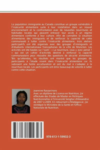 La population immigrante au Canada constitue un groupe vulnérable à l'insécurité alimentaire suite à leur installation dans un nouvel environnement et la confrontation avec de nouvelles nourritures et habitudes locales qui peuvent entraver leur accès à un régime alimentaire conforme à leur culture. Afin de connaître la situation alimentaires des immigrants et de renforcer la capacité de cette communauté à lutter contre l'insécurité alimentaire, trois ateliers participatifs ont été organisés avec des groupes d'immigrants et d'étudiants internationaux francophones de la ville de Moncton. Les activités ont été basées sur l'outil : « La nourriture, vous y avez pensé ? » qui est un cahier d'activités destiné à renforcer la capacité communautaire pour résoudre des questions de sécurité alimentaire. Tels qu'attendus, les résultats ont montré que les groupes de participants à l'étude vivent dans l'insécurité alimentaire car ils subissent une faible acculturation et ont du mal à s'adapter à la nourriture locale. Les participants ont émis beaucoup de volonté à lutter contre cette situation.