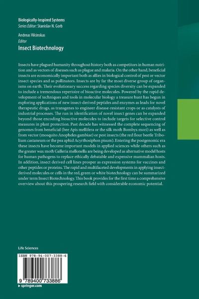 Part 1: Insect Biotechnology in Medicine1: The greater wax moth Galleria mellonella as an alternative model host for human pathogens; Krishnendu Mukherjee, Eugen, Domann, Torsten Hain2: Fruit flies as models in biomedical research - a Drosophila asthma model; Thomas, Roeder, Kerstin Isermann, Christina Wagner, Christine Warmbold3: Therapeutic potential of antimicrobial peptides from insects; Jochen Wiesner, Andreas Vilcinskas4: From traditional maggot therapy to modern biosurgery ; Andreas Vilcinskas5: Insect-associated microorganisms as source for novel secondary metabolites with therapeutic potential; Helge Bode,6: Potential pharmaceuticals from insects and their co-occurring microorganisms; Konrad DettnerPart 2: Insect Biotechnology in Plant Protection7: Insect antimicrobial peptides as new weapons against plant pathogens; Carin Jansen, Karl-Heinz Kogel8: Protection of Crops against Insect Pests using RNA Interference; John Gatehouse, Daniel Price9: Insect Transgenesis and the Sterile insect technique; Marc Schetelig, Ernst Wimmer,Part 3: Industrial applications of Insect Biotechnology10: Insect cells for heterologous protein expression; Christoph Becker-Pauly, Walter Stöcker11: Biotechnologies based on silk; Frantisek Sehnal12: Biosensors on the basis of insect olfaction; Sebastian, Paczkowski, Bernd Weißbecker, Michael Schöning, Stefan Schütz13: Insect-Inspired technologies: Insects as a source for biomimetics; Stanislas Gorb
