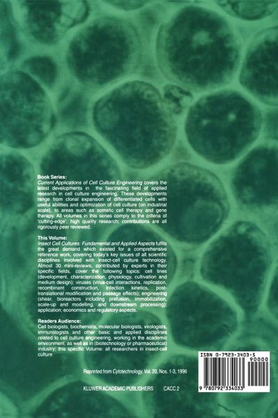 Insect Cell Cultures: Fundamental and Applied Aspects is a comprehensive reference work, covering the key issues involved in nearly 30 review papers: cell lines (development, characterisation, physiology, cultivation and medium design); viruses (virus-cell interactions, replication, recombinant construction, infection kinetics, post-translational modification and passage effects); engineering (shear, bioreactors including perfusion, immobilisation, scale-up and modelling, downstream processing); applications; economics and regulatory aspects. For cell biologists, biochemists, molecular biologists, virologists, immunologists and other basic and applied disciplines related to cell culture engineering, both academic and industrial.