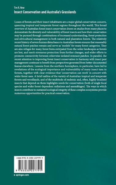 This book is a broad overview of conservation needs of grassland insects in Australia, drawing on the background provided elsewhere in the world on the responses to disturbances, and the ecological importance, of some key insect groups (notably Orthoptera, Hemiptera and Lepidoptera) to suggest how insect conservation in native, pastoral and urban grasslands may be advanced. The substantial references given for each chapter facilitate entry for non-entomologist grassland managers and stewards to appreciate the diversity and importance of Australia's grassland insects, their vulnerabilities to changes, and the possibilities for conserving them and the wider ecological roles in which they participate.