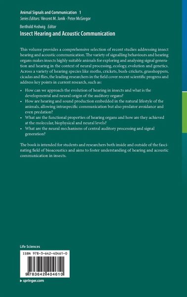This volume provides a comprehensive selection of recent studies addressing insect hearing and acoustic communication. The variety of signalling behaviours and hearing organs makes insects highly suitable animals for exploring and analysing signal generation and hearing in the context of neural processing, ecology, evolution and genetics. Across a variety of hearing species like moths, crickets, bush-crickets, grasshoppers, cicadas and flies, the leading researchers in the field cover recent scientific progress and address key points in current research, such as: - How can we approach the evolution of hearing in insects and what is the developmental and neural origin of the auditory organs? - How are hearing and sound production embedded in the natural lifestyle of the animals, allowing intraspecific communication but also predator avoidance and even predation? - What are the functional properties of hearing organs and how are they achieved at the molecular, biophysical and neural levels? - What are the neural mechanisms of central auditory processing and signal generation?