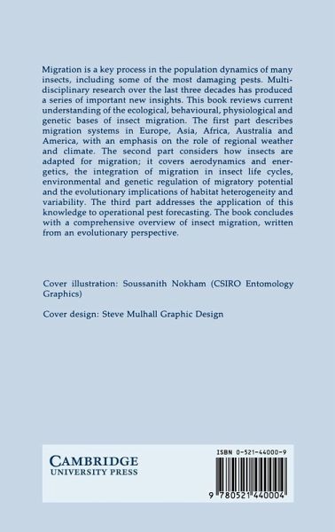 Migration is a key process in the population dynamics of many insects, including some of the most damaging pests. Multidisciplinary research over the last three decades has produced a series of important new insights. This book reviews current understanding of the ecological, behavioural, physiological and genetic bases of insect migration. The first part describes migration systems in Europe, Asia, Africa, Australia and America, with an emphasis on the role of regional weather and climate. The second part considers how insects are adapted for migration; it covers aerodynamics and energetics, the integration of migration in insect life cycles, environmental and genetic regulation of migratory potential and the evolutionary implications of habitat heterogeneity and variability. The third part addresses the application of this knowledge to operational pest forecasting. The book concludes with a comprehensive overview of insect migration, written from an evolutionary perspective.