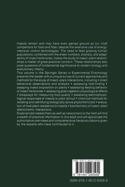 The authoritative overviews in this volume provide a wealth of practical information on current approaches to the study of insect-plant interactions. Methods described include direct behavioral observation; assays of host finding, oviposition, and feeding behavior of insect herbivores; post-ingestion physiological effects; measurement of food quality and sensory responses of insects to plant stimuli; chemical isolation and identification of active phytochemicals; evaluation of plant resistance to insects; and the biochemistry of allelochemic interactions.