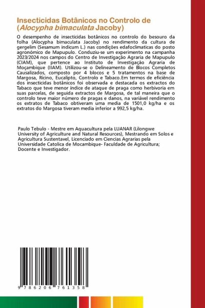 O desempenho de insecticidas botânicos no controlo do besouro da folha (Alocypha bimaculata Jacoby) no rendimento da cultura de gergelim (Sesamum indicum L.) nas condições edafoclimaticas do posto agronómico de Mapupulo. Conduziu-se um experimento na campanha 2023/2024 nos campos do Centro de Investigação Agraria de Mapupulo (CIAM), que pertence ao Instituto de Investigação Agraria de Moçambique (IIAM). Utilizou-se o Delineamento de Blocos Completos Causalizados, composto por 4 blocos e 5 tratamentos na base de Margosa, Rícino, Eucalipto, Controlo e Tabaco.Em termos de eficiência dos insecticidas botânicos foi observada e destacada os extractos do Tabaco que teve menor índice de ataque de praga como herbivoria em suas parcelas, de seguida extractos de Margosa, de tal maneira que o controlo teve maior número de pragas e danos, na variável rendimento os extratos de Tabaco obtiveram uma media de 1501,0 kg/ha e os extratos do Margosa tiveram media inferior a 992,5 kg/ha.