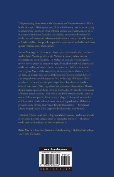 This pioneering book looks at the importance of insects to culture. While in the developed West a good deal of time and money may be spent trying to exterminate insects, in other cultures human-insect relations can be far more subtle and multi-faceted. Like animals, insects may be revered or reviled - and in some tribal communities insects may be the only source of food available. How people respond to, make use of, and relate to insects speaks volumes about their culture. In an effort to get to the bottom of our vexed relationship with the insect world, Brian Morris spent years in Malawi, a country where insects proliferate and people contend. In Malawi as in many tropical regions, insects have a profound impact on agriculture, the household, disease and medicine, and hence on oral literature, music, art, folklore, recreation and religion. Much of the complexity of human-insect relations rests on paradox: insects may represent the source of contagion, but they are also integral to many folk remedies for a wide range of illnesses. They may be at the root of catastrophic crop failure, but they can also be a form of sustenance.Weaving science with personal observations, Morris demonstrates a profound and intimate knowledge of virtually every aspect of human-insect relations. Not only is this book extraordinarily useful in terms of the more practical side of entomology, it also provides a wealth of information on the role of insects in cultural production. Malawian proverbs alone provide many such delightful examples - 'Bemberezi adziwa nyumba yake' ('The carpenter bee knows his own home'). This final volume in Morris' trilogy on Malawi's animal and insect worlds is certain to become a classic study of uncharted territory - the insect world that surrounds us and how we relate to it. Praise for The Power of Animals:Although based upon examination of a single culture, Morris incorporates ecological and anthropological concepts that expand this study of