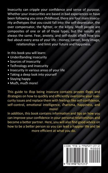 Insecurity can cripple your confidence and sense of purpose. Whether your insecurities are based in bad experiences or have been following you since childhood, there are four main insecurity archetypes that you could fall into: the self-deprecator, the over compensator, the fighter, or the killjoy. Most people are composites of one or all of these types, but the results are always the same. Fear, anxiety, and self-doubt affect how you feel about every area of your life - money, career, body image, relationships - and limit your future and happiness. In this book you will learn:Understanding insecurity Sources of insecurity Technology and insecurity Insecurity in various areas of your life Taking a deep look into yourself Staying happy Much, much more! This guide to stop being insecure contains proven steps and strategies on how to quickly and efficiently overcome your insecurity issues and replace them with feelings like self-confidence, self-control, emotional intelligence, charisma, happiness, and more! In addition, this book contains information and tips on how you can improve your confidence in your personal relationships and become a better partner. Here, you will also find good advice on how to be a better person so you can lead a happier life and be more efficient at what you do.