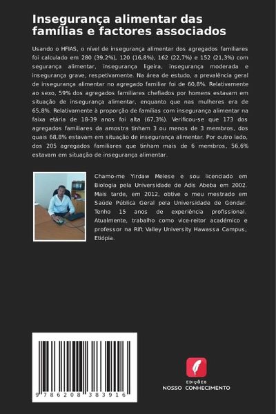Usando o HFIAS, o nível de insegurança alimentar dos agregados familiares foi calculado em 280 (39,2%), 120 (16,8%), 162 (22,7%) e 152 (21,3%) com segurança alimentar, insegurança ligeira, insegurança moderada e insegurança grave, respetivamente. Na área de estudo, a prevalência geral de insegurança alimentar no agregado familiar foi de 60,8%. Relativamente ao sexo, 59% dos agregados familiares chefiados por homens estavam em situação de insegurança alimentar, enquanto que nas mulheres era de 65,8%. Relativamente à proporção de famílias com insegurança alimentar na faixa etária de 18-39 anos foi alta (67,3%). Verificou-se que 173 dos agregados familiares da amostra tinham 3 ou menos de 3 membros, dos quais 68,8% estavam em situação de insegurança alimentar. Por outro lado, dos 205 agregados familiares que tinham mais de 6 membros, 56,6% estavam em situação de insegurança alimentar.