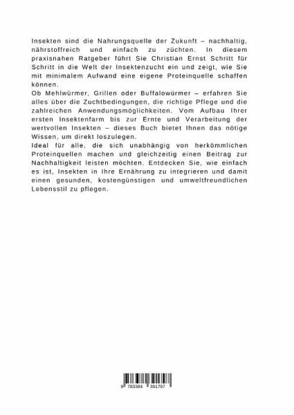 Insekten sind die Nahrungsquelle der Zukunft - nachhaltig, nährstoffreich und einfach zu züchten. In diesem praxisnahen Ratgeber führt Sie Christian Ernst Schritt für Schritt in die Welt der Insektenzucht ein und zeigt, wie Sie mit minimalem Aufwand eine eigene Proteinquelle schaffen können.Ob Mehlwürmer, Grillen oder Buffalowürmer - erfahren Sie alles über die Zuchtbedingungen, die richtige Pflege und die zahlreichen Anwendungsmöglichkeiten. Vom Aufbau Ihrer ersten Insektenfarm bis zur Ernte und Verarbeitung der wertvollen Insekten - dieses Buch bietet Ihnen das nötige Wissen, um direkt loszulegen.Ideal für alle, die sich unabhängig von herkömmlichen Proteinquellen machen und gleichzeitig einen Beitrag zur Nachhaltigkeit leisten möchten. Entdecken Sie, wie einfach es ist, Insekten in Ihre Ernährung zu integrieren und damit einen gesunden, kostengünstigen und umweltfreundlichen Lebensstil zu pflegen.