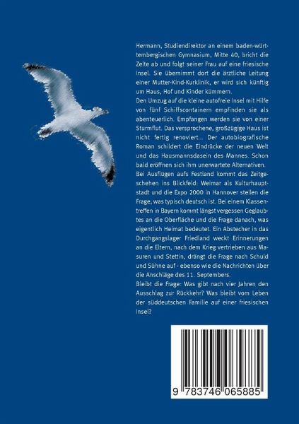 Hermann, Studiendirektor an einem baden-württembergischen Gymnasium, Mitte 40, bricht die Zelte ab und folgt seiner Frau auf eine friesische Insel.Den Umzug auf die kleine, autofreie Insel mit Hilfe von fünf Schiffscontainern empfinden sie als abenteuerlich. Empfangen werden sie von einer Sturmflut. Das versprochene, großzügige Haus ist nicht fertig renoviert ... Der autobiografische Roman schildert die Eindrücke der neuen Welt und das Hausmannsdasein des Mannes. Schon bald eröffnen sich ihm unerwartete Alternativen.Bei Ausflügen aufs Festland kommt das Zeitgeschehen ins Blickfeld: Weimar als Kulturhauptstadt und die Expo 2000 in Hannover stellen die Frage, was typisch deutsch ist. Bei einem Klassentreffen in Bayern kommt längst vergessen geglaubtes an die Oberfläche und die Frage danach, was eigentlich Heimat bedeutet. Ein Abstecher in das Durchgangslager Friedland weckt Erinnerungen an die Eltern, nach dem Krieg vertrieben aus Masuren und Stettin, drängt die Frage nach Schuld und Sühne auf - ebenso wie die Nachrichten über die Anschläge des 11. Septembers.Bleibt die Frage: Was gibt nach vier Jahren den Ausschlag zur Rückkehr? Was bleibt vom Leben der süddeutschen Familie auf einer friesischen Insel?