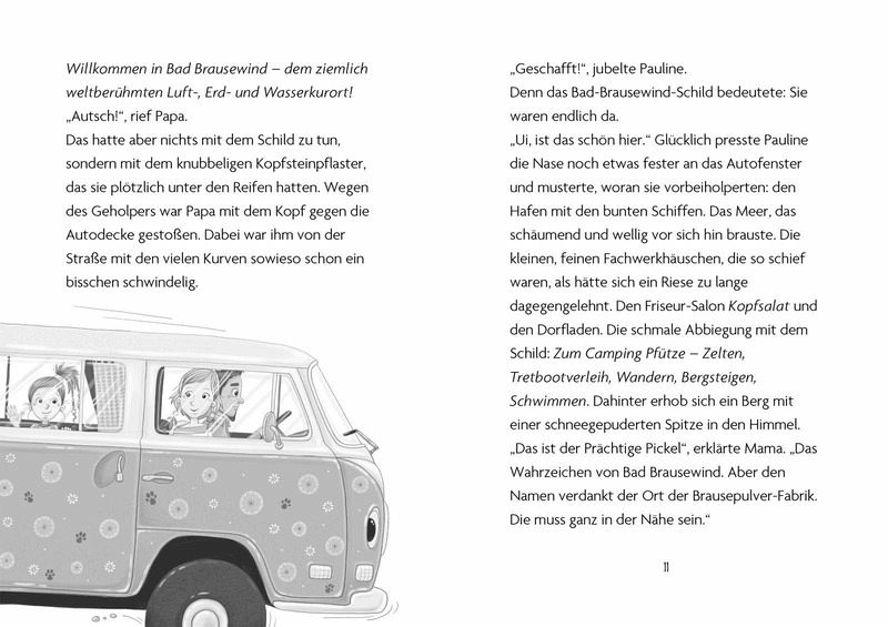 Was für ein süßes Buch, das von Anfang an rundum überzeugen kann. Das Cover finde ich sehr ansprechend durch seine niedlichen Bilder, die hellen Farben und die unglaublich niedliche Darstellung der Tiere. Diese zauberhaften Bilder finden wir in Schwarz-Weiß großzügig im Inneren des Buches und im Buchdeckel gibt es eine schöne Übersicht über die Insel mit all seinen zauberhaften Orten, die so schöne wohlklingende und lustige Namen tragen wie der Berg „Prächtiger Pickel“, der Campingplatz Pfütze oder etwa der kleine Bach Quackerbach. Diese Namen deuten bereits an, dass an Humor und witzigen Texten nicht gespart wird, was die Story amüsant und locker-flockig zu lesen macht. Die etwas größere Schrift ist passend für die Zielgruppe ab 8 Jahren. Die Geschichte selbst wartet mit allerlei netten Wortspielen, witzigen Ideen wie Namen der Bewohner oder dem „Abenteuer-Niesen“ von Pauline auf, sowie schrulligen, liebenswerten Personen.