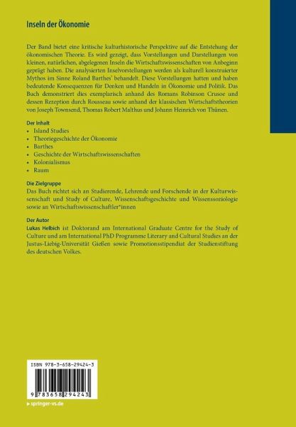 Der Band bietet eine kritische kulturhistorische Perspektive auf die Entstehung der ökonomischen Theorie. Es wird gezeigt, dass Vorstellungen und Darstellungen von kleinen, natürlichen, abgelegenen Inseln die Wirtschaftswissenschaften von Anbeginn geprägt haben. Die analysierten Inselvorstellungen werden als kulturell konstruierter Mythos im Sinne Roland Barthes' behandelt. Diese Vorstellungen hatten und haben bedeutende Konsequenzen für Denken und Handeln in Ökonomie und Politik. Das Buch demonstriert dies exemplarisch anhand des Romans Robinson Crusoe und dessen Rezeption durch Rousseau sowie anhand der klassischen Wirtschaftstheorien von Joseph Townsend, Thomas Robert Malthus und Johann Heinrich von Thünen.