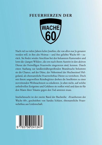 Nach viel zu vielen Jahren kehrt Josefine, die von allen nur Jo genannt werden will, in ihre alte Heimat - und ihre geliebte Wache 60 - zurück. Sie findet wieder Anschluss bei den bekannten Kameraden und lernt die »Jungen Wilden«, die erst nach ihrem Austritt in den aktiven Dienst der Freiwilligen Feuerwehr eingetreten sind, kennen. Durch einen Aushang zur landkreisübergreifenden Brandwache bekommt sie die Chance, auf der Düne, der Nebeninsel der Hochseeinsel Helgoland, als ehrenamtliche Feuerwehrfrau Dienst zu verrichten. Doch mit ihrem ungewollten Reisebegleiter drohen die Inselferien zu einer nervtötenden Weihnachtszeit zu eskalieren. Jo ahnt nicht, auf welche unheilvollen Ereignisse und Gefahren sie stoßen wird und dass sie für den Mann ihrer Träume gegen den Tod antreten muss. Inselsehnsucht ist der zweite Band der Buchreihe »Feuerherzen der Wache 60«, geschrieben von Sandra Schüen, ehrenamtliche Feuerwehrfrau aus Leidenschaft.