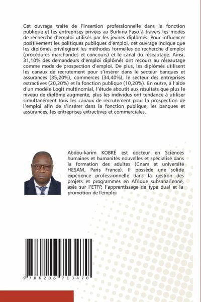 Cet ouvrage traite de l'insertion professionnelle dans la fonction publique et les entreprises privées au Burkina Faso à travers les modes de recherche d'emploi utilisés par les jeunes diplômés. Pour influencer positivement les politiques publiques d'emploi, cet ouvrage indique que les diplômés privilégient les méthodes formelles de recherche d'emploi (procédures marchandes et concours) et le canal du réseautage. Ainsi, 31,10% des demandeurs d'emploi diplômés ont recours au réseautage comme mode de prospection d'emploi. De plus, les diplômés utilisent les canaux de recrutement pour s'insérer dans le secteur banques et assurances (35,20%), commerces (34,40%), le secteur des entreprises extractives (20,20%) et la fonction publique (10,20%). En outre, à l'aide d'un modèle Logit multinomial, l'étude aboutit aux résultats que plus le niveau de diplôme augmente, plus les individus ont tendance à utiliser simultanément tous les canaux de recrutement pour la prospection de l'emploi afin de s'insérer dans la fonction publique, les banques et assurances, les entreprises extractives et commerciales.