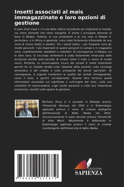 Il mais (Zea mays L.) è una delle colture cerealicole più importanti al mondo, sia come alimento che come mangime. È anche il principale alimento di base in Etiopia. Tuttavia, la sua produzione e la sua resa in Etiopia in particolare, e in Africa in generale, sono state fortemente influenzate da una serie di stress biotici e abiotici. Tra i vincoli biotici, i più frequenti sono gli insetti parassiti. I più importanti di questi parassiti in campo e in magazzino sono, rispettivamente, lepidotteri e coleotteri. Di conseguenza, in Etiopia, tra le altre cose, la sicurezza alimentare è stata fortemente minacciata dalle eccessive perdite post-raccolta di cereali come il mais a causa di insetti nocivi. Pertanto, la conservazione sicura dei cereali è molto importante perché ha un impatto diretto sulla riduzione della povertà, sulla sicurezza alimentare e del reddito e sulla prosperità dei piccoli agricoltori. Di conseguenza, è urgente mantenere la qualità dei cereali immagazzinati, come il mais, e gestirli correttamente. Questo libro fornisce quindi informazioni essenziali sul significato e sull'origine del mais, sulle sue condizioni di conservazione, sugli insetti parassiti e sulla loro importanza economica, nonché sulle opzioni di gestione.