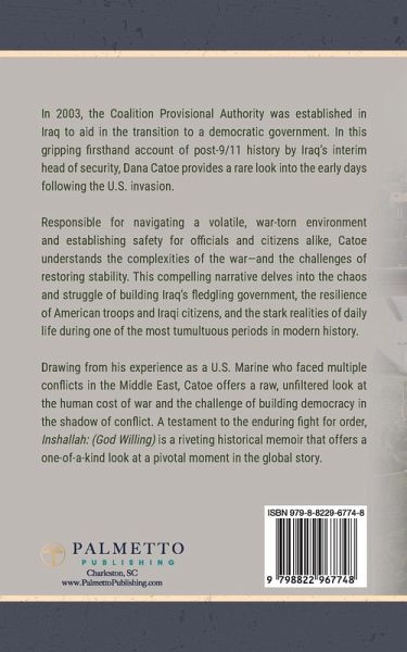 Chaos and hope collide in this unforgettable book on the horrors of war, cultural tensions, and the development of a fledgling democracy during Bush-era Iraq. Authored by Interim Iraqi Head of Security Dana Catoe. Step inside a tumultuous era of global history in this powerful memoir where Iraq's former head of security, tells the true story of the Iraq War. As a pivotal player in Iraq's interim democratic government from its inception in 2003 through the nation's first free elections, Dana Catoe was tasked with protecting government officials, Iraqi employees, and civilians during a time of terror attacks and raging conflict. Catoe provides a rare, unfiltered perspective on the challenges of rebuilding a nation in the aftermath of the U.S. invasion. Catoe draws on an extensive military background as a U.S. Marine, exposing us to the daily realities of life in the upper echelons of a provisional government-a perspective few have been privileged to experience. Beyond the halls of government, he also shares the struggles of ordinary Iraqi citizens caught in the tumult of change, terror threats, and political upheaval. With vivid storytelling and an insider's view on Bush-era Iraq, Inshallah: (God Willing) is a book of tremendous importance for history, offering a one-of-a-kind, behind-the-scenes look at the successes and failures of America's intervention in the Middle East. For fans of military memoirs, political history, and stories of human courage, or for students studying this defining era of world history, it is a can't-miss. Both harrowing and inspiring, Catoe's story illuminates the complexities of global conflict, the painful realities of war, and the fragile hope of democracy.