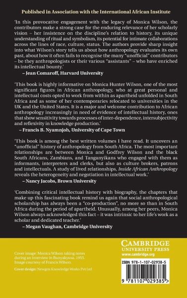 Inside African Anthropology offers an incisive biography of the life and work of South Africa's foremost social anthropologist, Monica Hunter Wilson. By exploring her main fieldwork and intellectual projects in southern Africa between the 1920s and 1960s, the book offers insights into her personal and intellectual life. Beginning with her origins in the remote Eastern Cape, the authors follow Wilson to the University of Cambridge and back into the field among the Mpondo of South Africa, where her studies resulted in her 1936 book Reaction to Conquest. Her fieldwork focus then shifted to Tanzania, where she teamed up with her husband, Godfrey Wilson. In the 1960s, Wilson embarked on a new urban ethnography with a young South African anthropologist, Archie Mafeje, one of the many black scholars she trained. This study also provides a meticulously researched exploration of the indispensable contributions of African research assistants to the production of this famous woman scholar's cultural knowledge about mid-twentieth-century Africa.