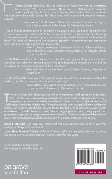 "Inside Defense should be required reading for those who want to understand the military's role in international affairs and its relationship to domestic politics and society. It fills a gap in the security studies literature and will soon become the single source for those who think about and practice national security." - Lawrence J. Korb, Senior Fellow at the Center for American Progress and a Senior Advisor to the Center for Defense Information.