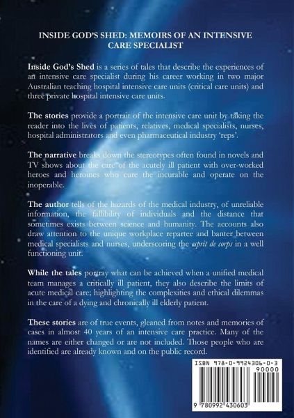 Inside God's Shed is a series of tales that describe the experiences of an Intensive Care specialist during his career working in two major Australian teaching hospital intensive care units (critical care units) and three private hospital intensive care units. The stories provide a portrait of the intensive care unit by taking the reader into the lives of patients, relatives, medical specialists, nurses, hospital administrators and even pharmaceutical industry 'reps'. The narrative breaks down the stereotypes often found in novels and TV shows about the care of the acutely ill patient with over-worked heroes and heroines who cure the incurable and operate on the inoperable. The accounts tell of the hazards of the medical industry, of unreliable information, the fallibility of individuals and the distance that sometimes exists between science and humanity. They also draw attention to the unique workplace repartee and banter between medical specialists and nurses, underscoring the esprit de corps in a well functioning unit. While the tales portray what can be achieved when a unified medical team manages a critically ill patient, they also describe the limits of acute medical care; highlighting the complexities and ethical dilemmas in the care of a dying and chronically ill elderly patient. These stories are of true events, gleaned from notes and memories of cases in almost 40 years of an intensive care practice. Many of the names are either changed or are not included. Those people who are identified are already known and on the public record.