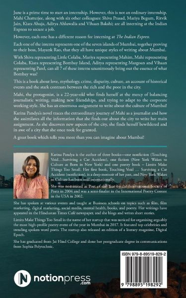 June marks the perfect time to begin an internship, but for Mahi Chatterjee and her six colleagues, it's more than just a stepping stone to a job. Each of them, representing a different island of Mumbai, brings a unique perspective on the city to their internship at The Indian Express - and their shared mission is to prove their writing style is worthy of a permanent role. Mahi, along with Shiva, Mariya, Ritvik, Kiara, Aditya, and Vihaan, are tasked with documenting Mumbai's multifaceted identity, yet they all have their own reasons for choosing this path. Shiva, with his ties to Little Colaba; Mariya, from Mahim; Mahi representing Colaba; Kiara, who speaks for Bombay Island; Aditya for Mazgaon; Ritvik for Worli and Vihaan, a voice for Parel, all bring distinct views of the city's past and present to their work. But can they collectively capture the essence of a city that's as complex and diverse as their backgrounds? Mahi, the protagonist, is a 21-year-old who finds herself at the mercy of balancing journalistic writing, making new friendships, and trying to adapt to the corporate working style. She has an enormous assignment to write about the culture of Mumbai! Karina Pandya's novel traces the extraordinary journey of Mahi as a journalist and how she assimilates all the information that she finds out about the city to write her main assignment. As she discovers new aspects of the city, she finds herself bewildered and in awe of a city that she once took for granted. A great book which tells you more than you can imagine about Mumbai!