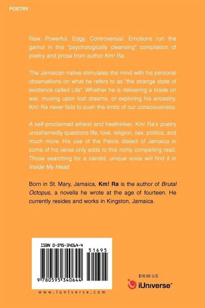 Raw. Powerful. Edgy. Controversial. Emotions run the gamut in this "psychologically cleansing" compilation of poetry and prose from author Km! Ra. The Jamaican native stimulates the mind with his personal observations on what he refers to as "the strange state of existence called Life". Whether he is delivering a tirade on war, musing upon lost dreams, or exploring his ancestry, Km! Ra never fails to push the limits of our consciousness. A self-proclaimed atheist and freethinker, Km! Ra's poetry unashamedly questions life, love, religion, sex, politics, and much more. His use of the Patois dialect of Jamaica in some of his verse only adds to this richly compelling read. Those searching for a candid, unique voice will find it in Inside My Head.