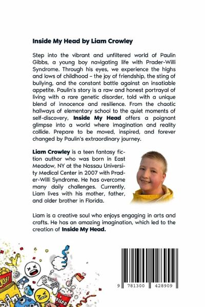 What if the world wasn't built for you? Paulin Gibbs, a young boy with Prader-Willi Syndrome, invites you into the kaleidoscope of his mind in Inside My Head. It's a place where boundless imagination clashes with the stark realities of a body that betrays him. Liam Crowley's debut isn't just a story - it's an experience. Feel the dizzying highs of childhood friendship, the crushing weight of bullying, and the relentless hunger that defines Paulin's existence. Raw, unflinching, and profoundly moving, Inside My Head strips away preconceptions and leaves you forever changed. This is not just a book about a boy with a rare genetic disorder - it's a testament to the resilience of the human spirit, told with an innocence that will break your heart and mend it again.