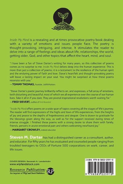 Inside My Mind is a revealing and at times provocative poetry book dealing with a variety of emotions and issues people face. The poetry is thought-provoking, intriguing, and intense. It stimulates the reader to delve into a range of feelings and ideas about life, relationships, the world, getting older, God, and other topics that affect the heart, mind, and soul.