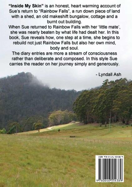 Don't buy 'Inside my Skin' unless you're serious about reading....A writing style described as fast paced. Shooting straight from the hip, raw and honest, to no-holds-barred. Inside my Skin doesn't side-step any encounter had moving from residential living in Mildura and the Illawarra, to mountainous country in Tasmania. Dublin Town, population 25, including dogs, too small for a postcode. Taking the dirt road over the mountain into St Marys, population 1,000, postcode 7215.... Quote Dawn: I couldn't put the book down.... Quote Rod D: I'd love to visit Rainbow Falls since reading the book....
