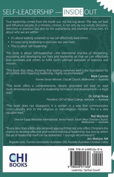 Inside Out: A Biblical & Practical Guide to Self-leadership by Bruce Hills. True leadership comes from the inside out, not the top down. The way we lead and influence people, in a ministry context, is not only by our words, decisions, directives or position, but also by the authenticity and example of our lives. It's about who we are within. It's about leading ourselves so we can effectively lead others. It's exercising leadership in and over our own lives. This is called 'self-leadership'. This book is about 'self-leadership'-the intentional practice of disciplining, regulating and developing our lives and leadership so that we can effectively lead ourselves and others to fulfill God's ultimate purposes of maturity and mission. "This book digs deep, showing that leading ourselves well is the foundation for all credible and impacting leadership. Highly recommended." Mark Conner, Former Senior Minister, CityLife Church, Melbourne - Australia. "This book offers a comprehensive, deeply grounded yet easy to read multi-dimensional approach to leadership formation and development-a must read." Dr Johan Roux, President, CEO of Tabor College, Adelaide - Australia. "This book does not disappoint. It is written in a way that communicates cross-culturally and to the religious or non-religious mindset. This is a very valuable read." Mal Macleod, Director Equip Ministries International, Senior Pastor, South West Christian Church, Melbourne - Australia. "Bruce describes a Biblically centered approach that not only offers Christians the chance to develop effective and resilient individual leadership, but one by which the art of leadership itself can be redeemed. I strongly recommend it." Jim Wallace AM, Brigadier (ret); Former commander of the Australian SAS, Founder of the Australian Christian Lobby.