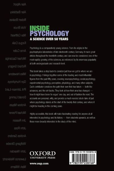 Psychology is a comparatively young science. From its origins in the psychophysics laboratories of late 19th century Germany, it made great strides throughout the 20th century, and can now be considered one of the most rapidly growing of the sciences, as evidenced by the enormous growth at both undergraduate level and research level. This book takes a step back to consider just how we got to where we are in psychology. It brings together some of the leading and most influential figures from the past 50 years, covering neuropsychology, social psychology, experimental psychology, perception, physiology and many others. Each contributor considers the path their own field has taken - both the advances, and the set-backs. They look at how their area has changed - how it might have been 'in vogue' one day, and out of fashion the next. The accounts are personal, witty, and provide a much needed stock-take of just where psychology stands at the start of the 21st century, and where it might be heading in the coming years. Highly accessible, the book will make fascinating reading for anyone at all interested in psychology and its history- from students upwards, as well as those more broadly interested in the study of the mind.