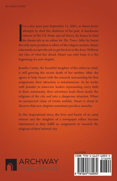 It is a few years past September 11, 2001, as Stuart Jones attempts to shed the skeletons of his past. A handsome veteran of the US Army special forces, he hopes to land his dream job as an editor for The Times. After he learns the only open position is editor of the religion section, Stuart reluctantly accepts the job to get his foot in the door. Without any idea of what lies ahead, Stuart can only hope it is the beginning of a new chapter. Jennifer Carter, the beautiful daughter of the editor-in-chief, is still grieving the recent death of her mother. After she agrees to help Stuart with the research surrounding his first assignment, their attraction is instantaneous. As he works with Jennifer to interview leaders representing every faith in their community, their adventure leads them inside the religions of the city and into a dangerous situation. When an unexpected chain of events unfolds, Stuart is about to discover that new chapters sometimes produce miracles. In this inspirational story, the lives and hearts of an army veteran and the daughter of a newspaper editor become intertwined as they fulfill an assignment to research the religions of their beloved city.