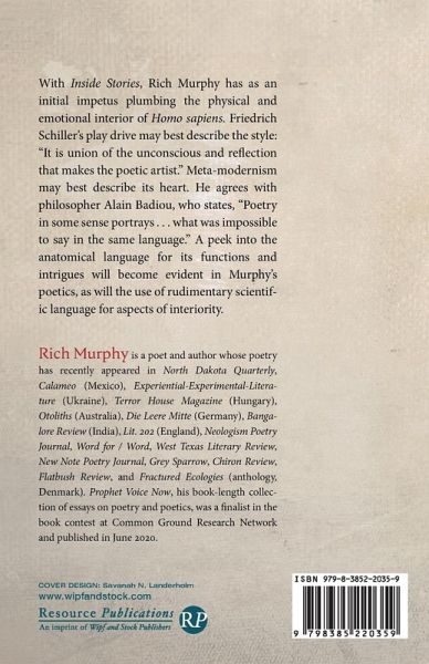 With Inside Stories, Rich Murphy has as an initial impetus plumbing the physical and emotional interior of Homo sapiens. Friedrich Schiller's play drive may best describe the style: ""It is union of the unconscious and reflection that makes the poetic artist."" Meta-modernism may best describe its heart. He agrees with philosopher Alain Badiou, who states, ""Poetry in some sense portrays . . . what was impossible to say in the same language."" A peek into the anatomical language for its functions and intrigues will become evident in Murphy's poetics, as will the use of rudimentary scientific language for aspects of interiority.