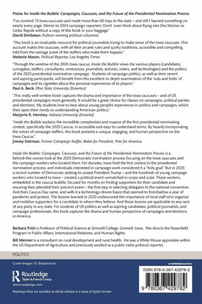 "Through the window of 2020 Iowa caucus, Inside the Bubble views the various players (candidates, surrogates, staffers, consultants, contractors, journalists, activists, voters, and technologies) and the politics of the 2020 presidential nomination campaign. Students of campaign politics, as well as their recent and aspiring participants, will benefit from this excellent in-depth examination of the 'nuts and bolts' of campaigns and its vignettes about the personal experiences of its players."
