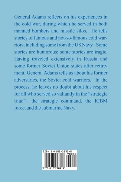 General Adams reflects on his experiences in the cold war, during which he served in both manned bombers and missile silos. He tells stories of famous and not-so-famous cold warriors, including some from the US Navy. Some stories are humorous; some stories are tragic. Having traveled extensively in Russia and some former Soviet Union states after retirement, General Adams tells us about his former adversaries, the Soviet cold warriors. In the process, he leaves no doubt about his respect for all who served so valiantly in the "strategic triad"-- the strategic command, the ICBM force, and the submarine Navy.
