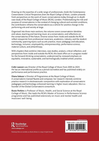 Drawing on the expertise of a wide range of professionals, Inside the Contemporary Conservatoire: Critical Perspectives from the Royal College of Music, London presents fresh perspectives on the work of music conservatoires today through an in-depth case study of the Royal College of Music (RCM), London. Problematising the role and purpose of conservatoires in the context of changing cultural and societal conditions, the contributors reframe the conservatoire as a vehicle for positive change in the performing arts and society at large.