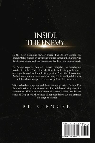 Dive into one of the best thriller books of 2024 with "Inside the Enemy" by BK Spencer. This gripping story follows Amirah Hamad, an Arabic reporter caught in the chaos of the Iraq war. After narrowly escaping a deadly explosion, Amirah is rescued by Kevin O'Conner, a brave sergeant in the United States Army Rangers. Amidst the dangers of war, their love blossoms, creating a compelling narrative that stands out among the best suspense books. As Amirah and Kevin navigate a trail of danger and betrayal, Amirah is forced to flee Iraq, leaving behind her forbidden love. This book reflects themes from both "The Secrets We Keep" and "Spy Games." Her incredible journey takes her from the deserts of Iraq to the heart of the United States of America, showcasing the tension and intrigue characteristic of top thriller books. "Inside the Enemy" is not just another war story; it's an exploration of love, loyalty, and the human spirit under extreme conditions. The narrative, rich with elements of special forces operations and investigative journalism, places this book among the thriller books best sellers. The suspenseful storyline and dynamic characters make it a standout choice for those seeking the best thriller books. For fans of titles like "The Unexpected Spy" and "Body of Lies," this novel offers a unique blend of real-world events and heart-pounding fiction. Amirah's tale is a testament to the enduring power of love and resilience in the face of war, making "Inside the Enemy" a must-read in the genre of thriller books. Whether you are interested in espionage books, special forces, or simply the best in suspense and thriller literature, "Inside the Enemy" by BK Spencer is a captivating addition to your reading list. Don't miss out on this enthralling story of love and survival in the midst of one of the world's most tumultuous conflicts.