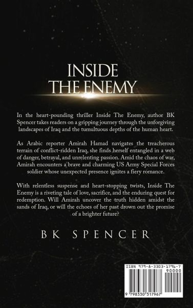 Dive into one of the best thriller books of 2024 with "Inside the Enemy" by BK Spencer. This gripping story follows Amirah Hamad, an Arabic reporter caught in the chaos of the Iraq war. After narrowly escaping a deadly explosion, Amirah is rescued by Kevin O'Conner, a brave sergeant in the United States Army Rangers. Amidst the dangers of war, their love blossoms, creating a compelling narrative that stands out among the best suspense books. As Amirah and Kevin navigate a trail of danger and betrayal, Amirah is forced to flee Iraq, leaving behind her forbidden love. This book reflects themes from both "The Secrets We Keep" and "Spy Games." Her incredible journey takes her from the deserts of Iraq to the heart of the United States of America, showcasing the tension and intrigue characteristic of top thriller books. "Inside the Enemy" is not just another war story; it's an exploration of love, loyalty, and the human spirit under extreme conditions. The narrative, rich with elements of special forces operations and investigative journalism, places this book among the thriller books best sellers. The suspenseful storyline and dynamic characters make it a standout choice for those seeking the best thriller books. For fans of titles like "The Unexpected Spy" and "Body of Lies," this novel offers a unique blend of real-world events and heart-pounding fiction. Amirah's tale is a testament to the enduring power of love and resilience in the face of war, making "Inside the Enemy" a must-read in the genre of thriller books. Whether you are interested in espionage books, special forces, or simply the best in suspense and thriller literature, "Inside the Enemy" by BK Spencer is a captivating addition to your reading list. Don't miss out on this enthralling story of love and survival in the midst of one of the world's most tumultuous conflicts.