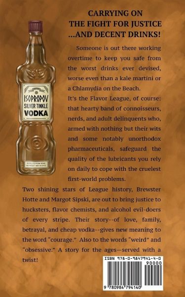 The fact is, you're probably not aware that someone is out there working overtime to keep you safe from the worst drinks ever devised, worse even than a kale martini or a Chlamydia on the Beach. And it's okay to admit it, because you're not alone. So little is known about the dark world of alcohol espionage that very few have heard the story of the Flavor League: that hearty band of connoisseurs, idealists, nerds, and adult delinquents who, armed with nothing but their wits and a few impressive examples of cutting-edge pharmacology, strive tirelessly to safeguard the quality of the lubricants you rely on daily to cope with brutal first-world problems. The story is emphatically not a dry history, some laundry list of exploits, removed from the daily lives of flesh-and-blood humans with real liver and kidney issues. In fact, it features two people real enough to stumble through the messy beginnings of a love affair while becoming legends in the field of ethanol policing: one a brilliant if somewhat erratic member of the League, the other a maverick tasting genius whose passionate hatred of vodka transforms the world of drinks. Two people who give new meaning to the word "courage". Also to the words "weird" and "obsessive." So let me invite you to settle in with a bottle or two of your favorite libation, and drink your way into the somewhat woozy heart of wine and spirits justice, the battle against hucksters and flavor chemists and alcohol evil-doers of every stripe, including the ruthless ringleaders of UNIVOD, the shadowy organization whose iron fist controls modern Russia and its vodka supply, and at one point nearly that of the rest of the world, too. How were the nefarious plans of these blackguards foiled? What's the best mineral water for a hangover? How do they get that horrible red color into those cherries? We've got a double shot of answers for you in this book: often shaken, sometimes stirred, sometimes even on the rocks-but always with a twist!