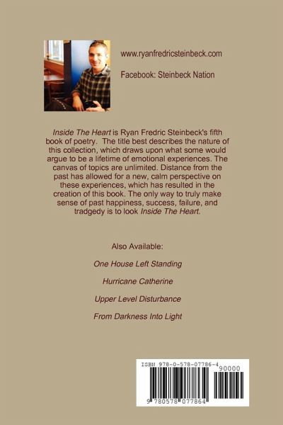 Ryan Steinbeck's fifth book of poetry. To make sense of past happiness, success, failure, and tradgedy, one must look Inside The Heart. This book is about this introspection into an overload of emotional experiences.