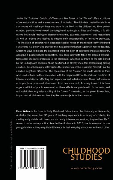 Inside the 'Inclusive' Childhood Classroom: The Power of the 'Normal' offers a critique of current practices and alternative view of inclusion. The rich data created inside three classrooms will challenge those who work in the field, as the children and their performances, previously overlooked, are foreground. Although at times confronting, it is ultimately invaluable reading for classroom teachers, students, academics, and researchers as well as anyone who desires to deepen their understanding of inclusive processes. The inclusion of children with diagnosed special needs in mainstream early childhood classrooms is a policy and practice that has gained universal support in recent decades. Exploring ways to include the diagnosed child has been of interest to inclusive research. Adopting a poststructural perspective, this book interrupts taken for granted assumptions about inclusive processes in the classroom. Attention is drawn to the role played by the undiagnosed children, those positioned as already included. Researching among children, this ethnography interrogates the production of the classroom 'normal'. As the children negotiate difference, the operations of the 'normal' are made visible in their words and actions. In their encounters with the diagnosed Other, they take up practices of tolerance and silence, effecting fear, separation, and a desire to cure. These performances echo practices, presumed abandoned, from centuries past. As a way forward this book urges a rethink of practice-as-usual, as these effects are problematic for inclusion and not sustainable. A greater scrutiny of the 'normal' is needed, as the power it exercises, impacts on all children and how they become subjects in the classroom.